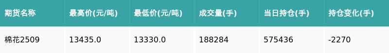 南财智讯5月26日电长宏策略,南财金融终端盘后期货数据显示,郑州商品交易所的棉花主力合约收跌0.3%,收盘报13385.0元/吨,日内资金流出3137.86万元。其他相关指标见下表: