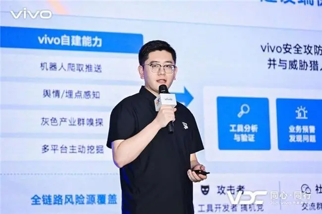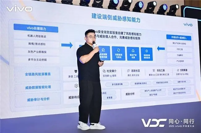 当下,黑灰产、业务侵蚀、恶意软件、社工 / 黑客攻击是造成企业与用户“双面伤害”的罪魁祸首。面对这些挑战,vivo展开了一系列的攻防战。vivo安全攻防实验室黑灰产对抗负责人朱远鹏介绍,首先是动态博弈,一方面,攻击者持续寻找新利益点、提高攻击隐蔽性;一方面,终端厂商则通过加深攻击理解、主动挖掘攻击渠道、沉淀对抗能力,实现攻防制衡。第二,聚焦未知领域,进行行业联合共创,从而优化防御效果。第三,通过“实时拦截当下威胁 + 策略迭代防御未来攻击”,深化技术纵深与生态协同,最终在移动终端黑灰产对抗中占据主动,守护业务和用户安全。