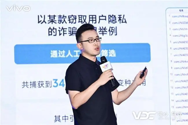 针对应用安全场景,vivo应用安全总监钱钰指出,风险应用对传统引擎的挑战越来越大。以某一窃取用户隐私的应用为例,在共捕获到349个同名的变种应用中,传统病毒引擎只检出了15例,检出率仅为4.3%。不仅如此,当前风险变种具有静态特征变化大、行为特征变化小、传播更灵活三大典型特点。为此,vivo在应用风险检测方面进行了全面升级,首次基于AI构建了“无样本依赖型”变种识别技术体系,重点覆盖了包括诈骗应用识别、利用无障碍类、后台弹广告类,风险应用识别等五类场景。检测模型自上线以来,已覆盖用户设备超1亿,日均检出超4万,累计识别恶意应用变种超470万次,识别能力提升到90%以上的同时,未发生过一例误报。