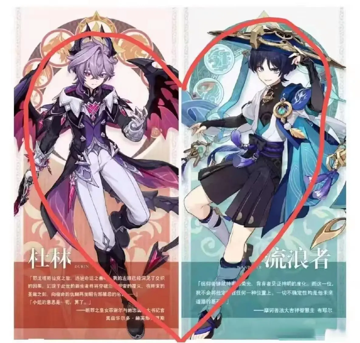 另外,有玩家发现杜林立绘夹带私货?你别说,你还真别说,红蓝我一开始都没注意到,而且站位正确对我xp,真是磕了!两位角色作为风属性最强人与火属性最强龙,两人组队肯定有说法,估计最强融化队阵容!